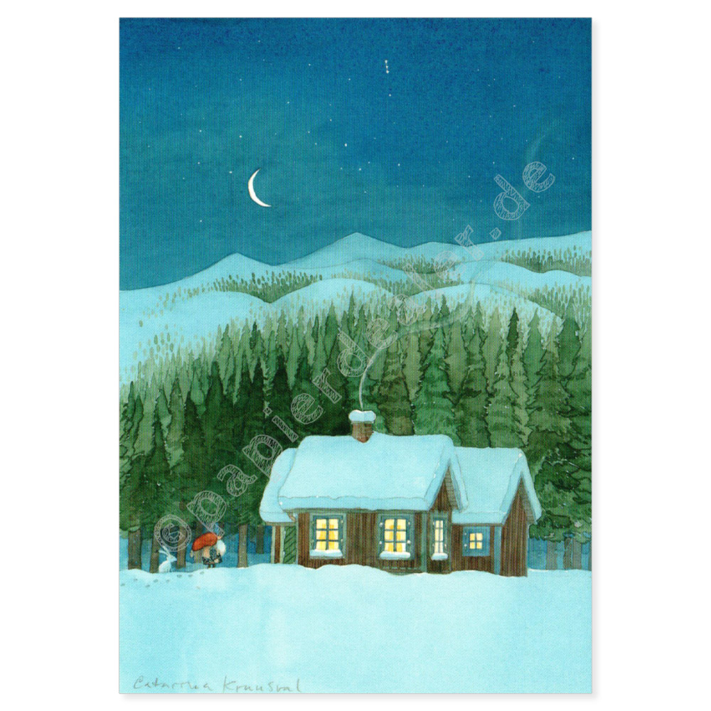 Keywords: postkarte, karte, postcrossing, fsc, naturpapier, abbaubarer lack, catarina kruusval,nacht, schnee, winter, zwerg, skandinavien, schweden, mond, blau, grün, wald