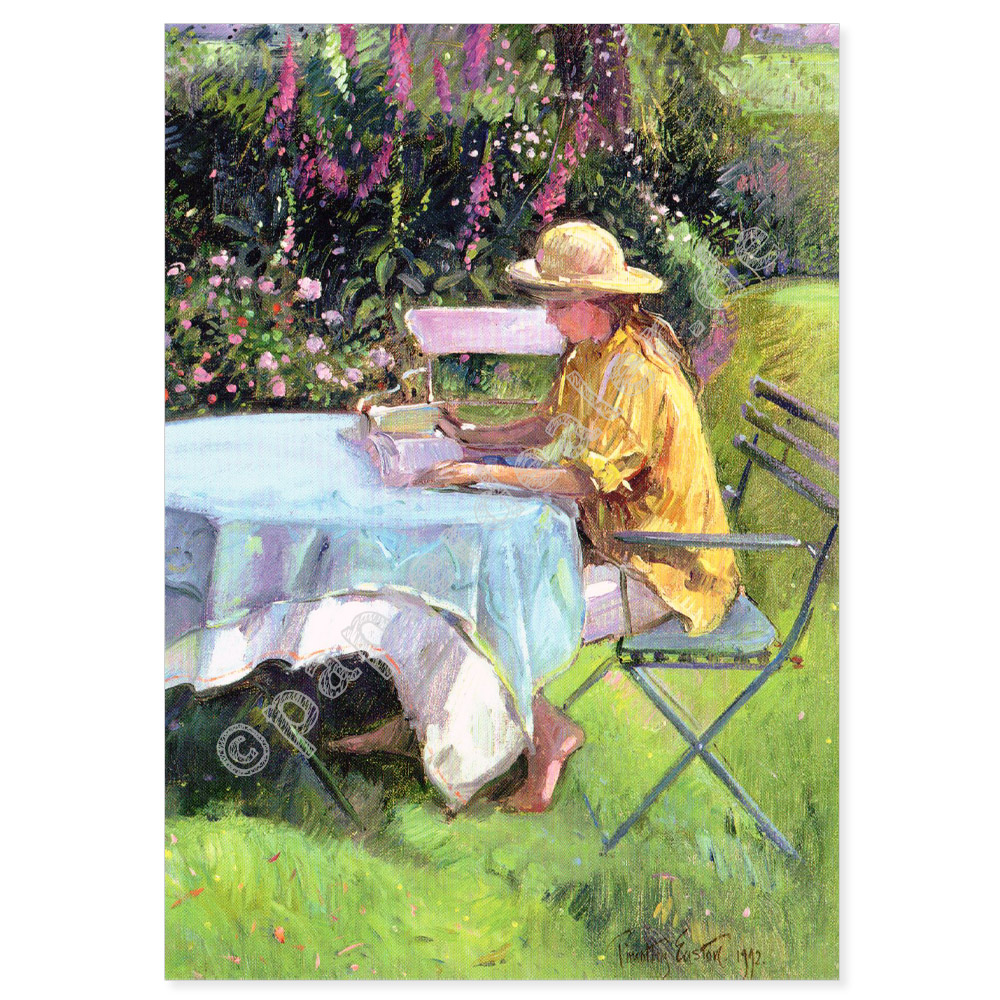 Keywords: postkarte, karte, postcrossing, kunst, gemälde, frau, timothy easton, garten, lesen, tisch, stuhl, grün, relax