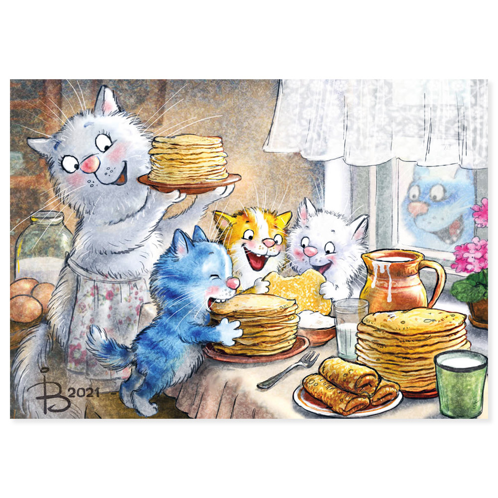 Keywords: postkarte, karte, postcrossing, rina zeniuk, blue cat, katze, tier, blau, backen, pfannkuchen, milch, krug, essen