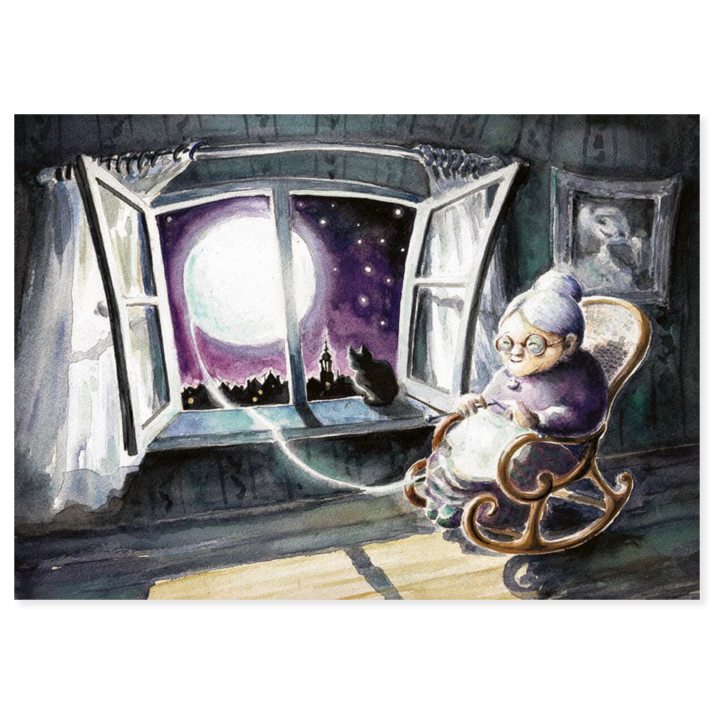 Keywords: postkarte, karte, postcrossing, dannywilde, frau, katze, mond, oma, stadt, stricken, schwarz, violett, tier