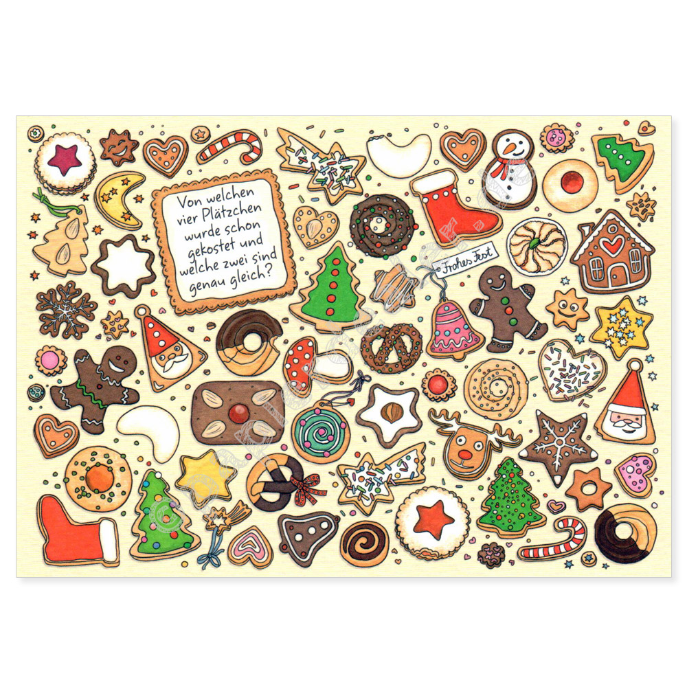 Keywords: postkarte, karte, postcrossing, wimmelbild, wimmelkarte, suchbild, suchkarte, charis bartsch, fsc, naturpapier, effektlack, rätsel, suchen, weihnachten, xmas, essen, plätzchen, keks, backen, lebkuchen, braun